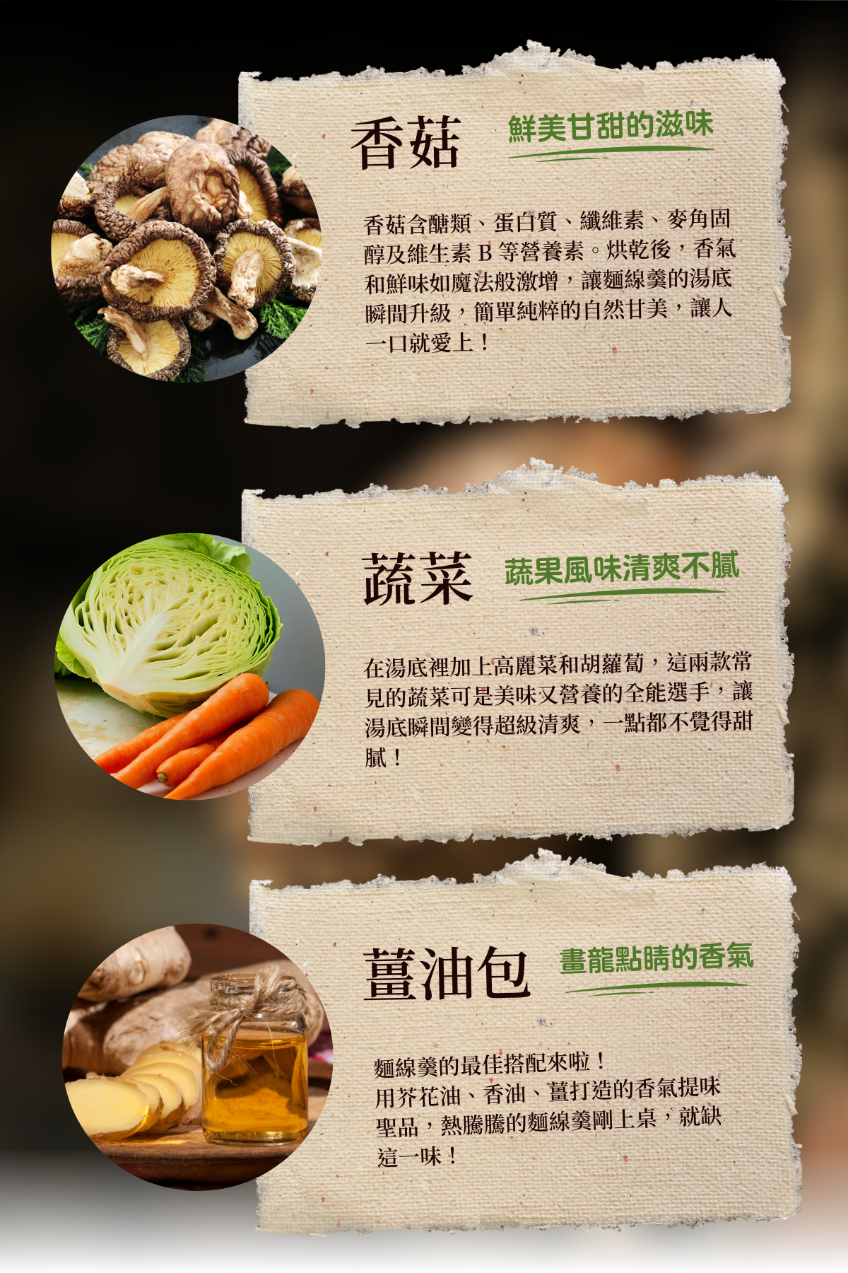 調味包:蔗糖、紅蘿蔔(含葡萄糖)、麥芽糊精、大豆蛋白、高麗菜(含葡萄糖)、昆布抽出物、芝麻粉、食鹽、當歸粉、酵母粉(酵母精粉、食鹽)、海苔、二氧化矽、香菇