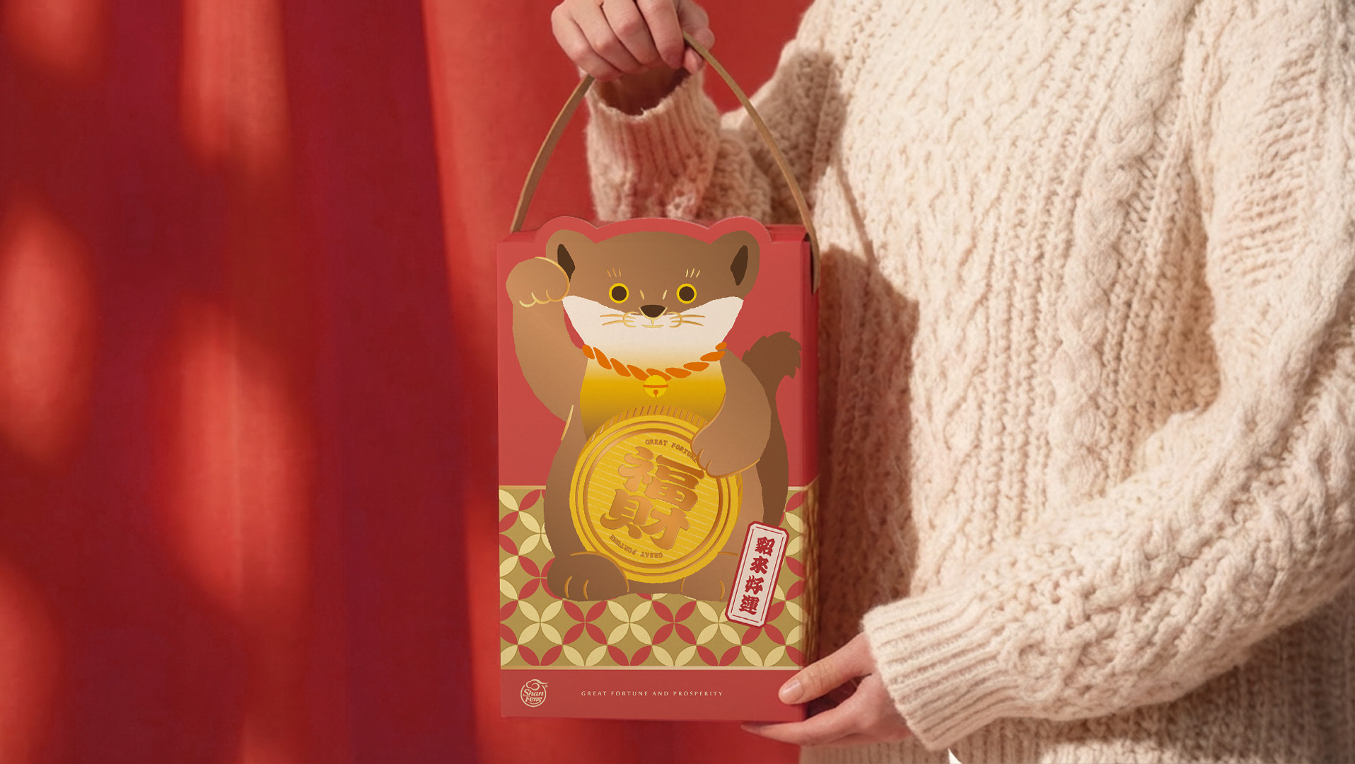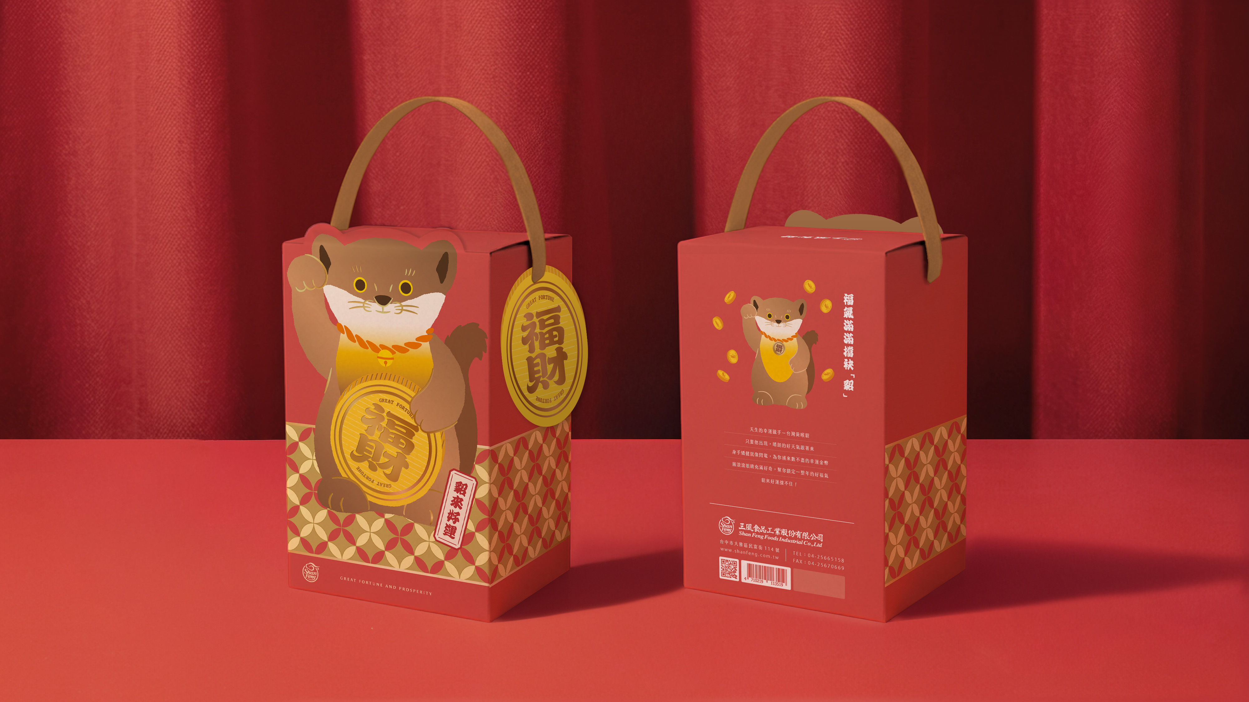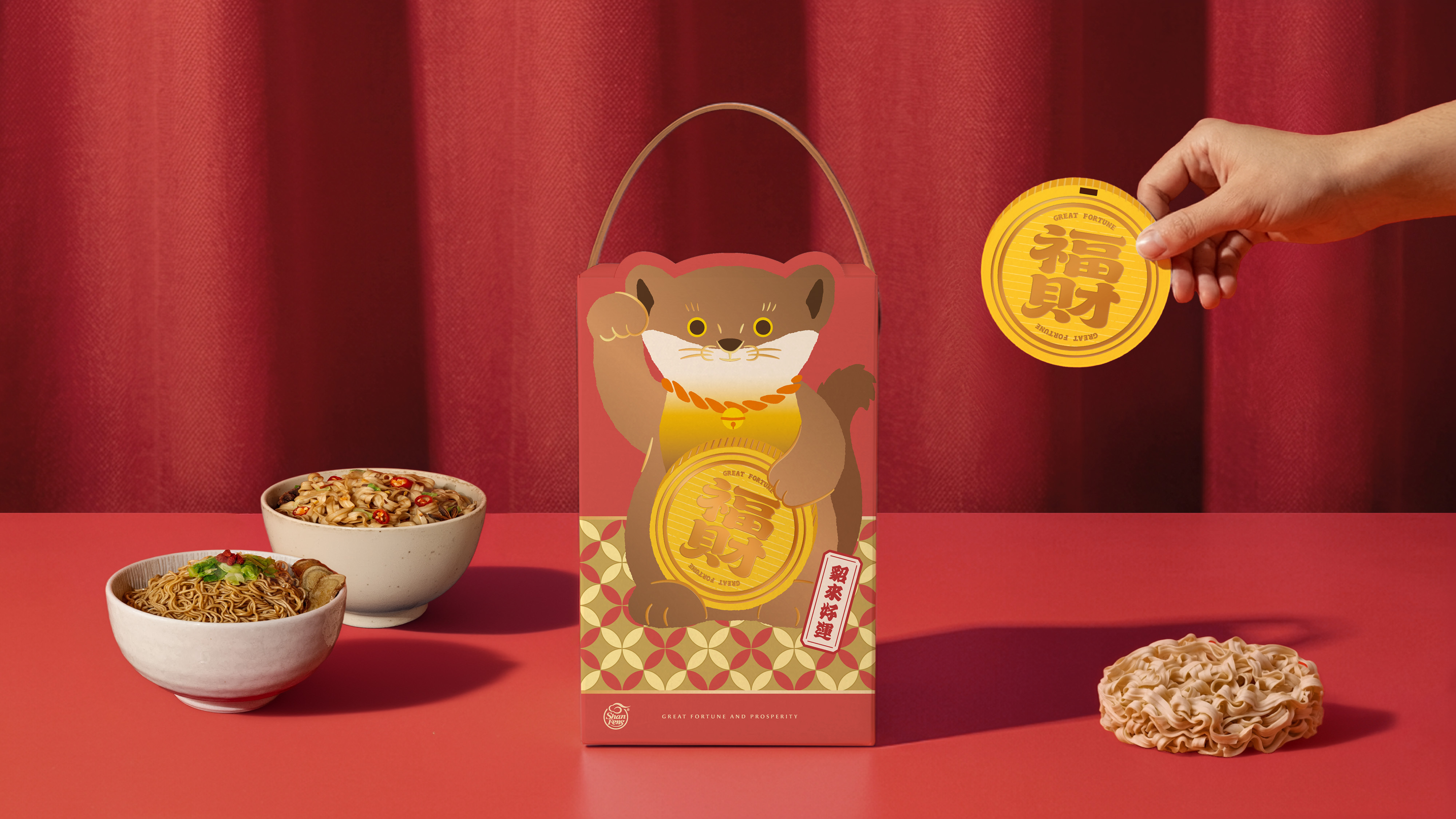 黃喉貂化身為禮盒主角,搭配金幣造型泡麵,象徵「財富+好運」雙重祝福