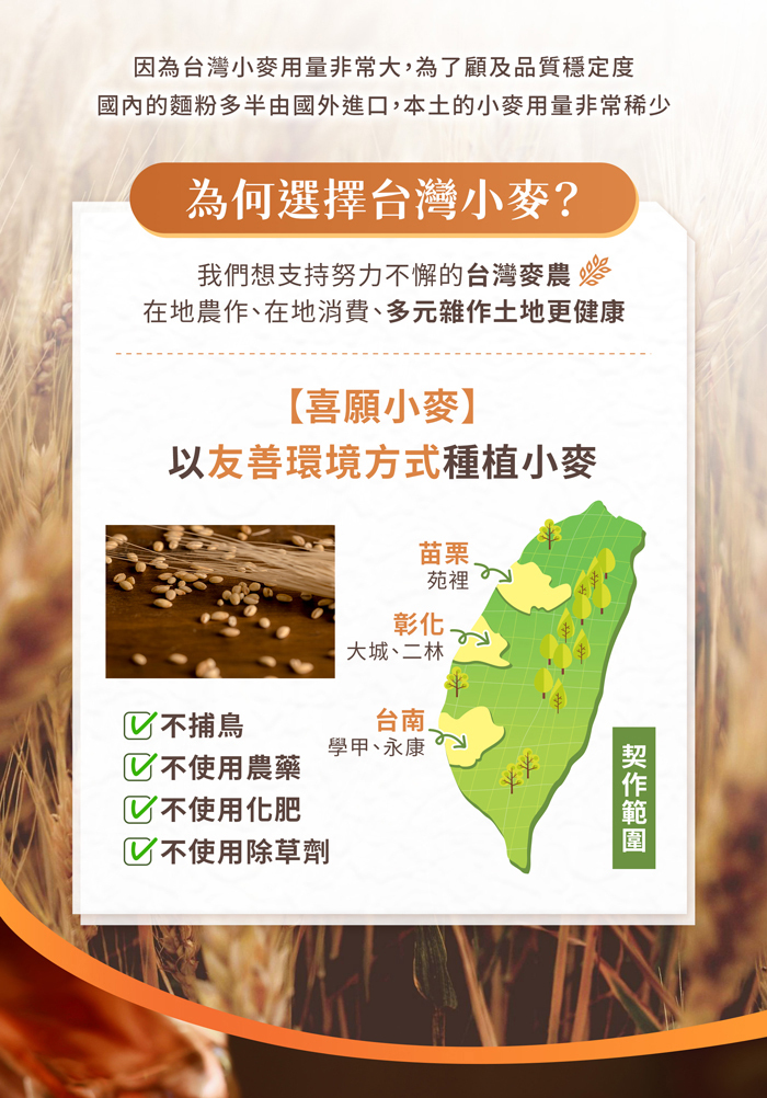 ・原料選用喜願與農民契作的台灣小麥(台中選二號)